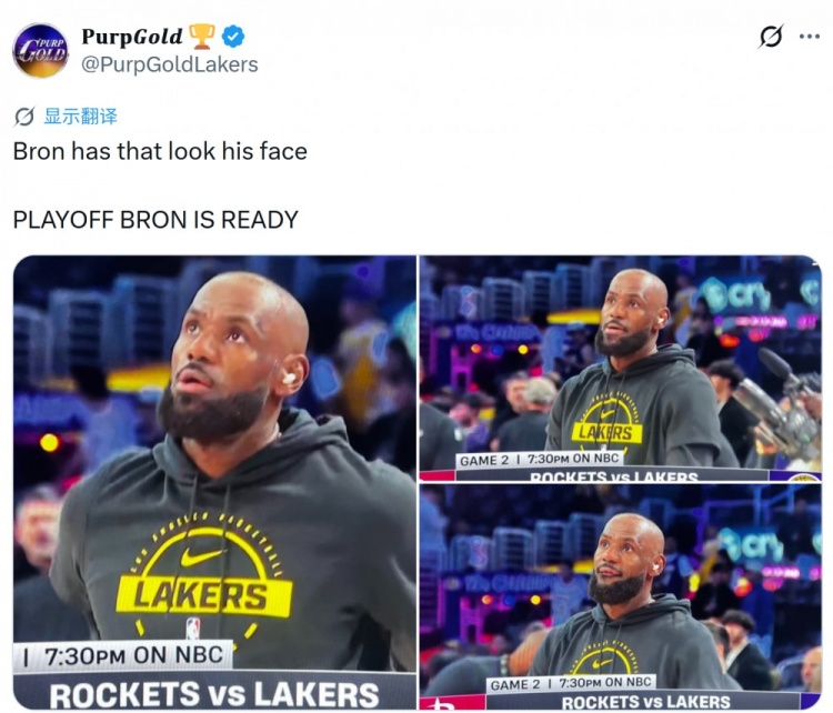 湖媒@PurpGoldLakers晒图并配文:“詹姆斯脸上露出了那熟悉的表情配资炒股新手入门,季后赛模式的詹姆斯已经准备好了。”